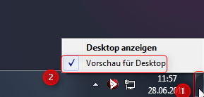 Aktivieren Sie die Aero Funktion auf die gleiche Weise. So schnell können Sie die Windows Desktopvorschau aktivireren und deaktivieren. Um den Desktop anzuzeigen klicken Sie mit der linken Maustaste.