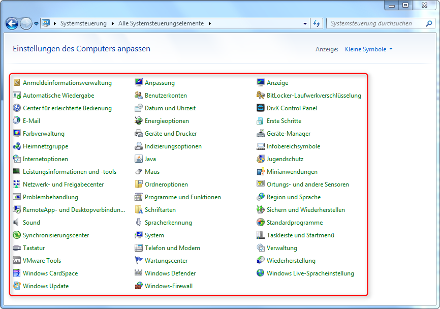 Nun haben Sie die ähnlich wie in Windows XP die klassische Ansicht der Systemsteuerung.