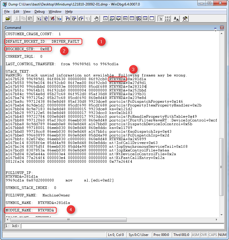 Nach dem Laden des Dump-Files steht häufig direkt unter "Probably caused by: XXXXX" die Ursache des Problems. In diesem Fall die Datei "RTKVHDA.sys". Eine Suche bei Google nach dieser Datei zeigt, das es sich hierbei um eine Datei des Audiotreibers handelt. Eine Neuinstallation oder ein Update des Audiotreibers könnte das Problem beheben.