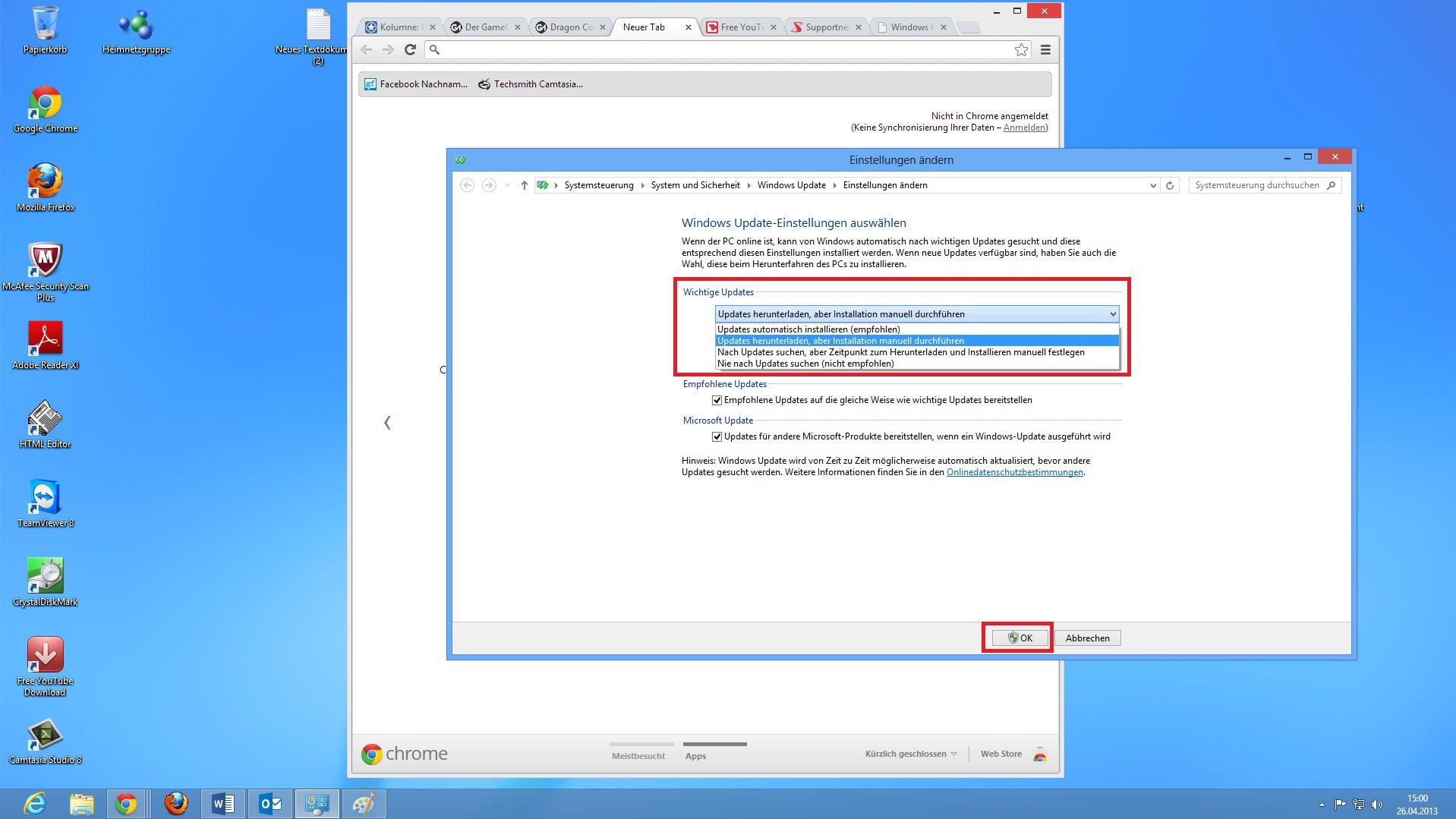 Wählt hier unter "Wichtige Updates" "Updates herunterladen, aber Installation manuell durchführen". Bestätigt die Eingabe mit einem klick auf "OK".