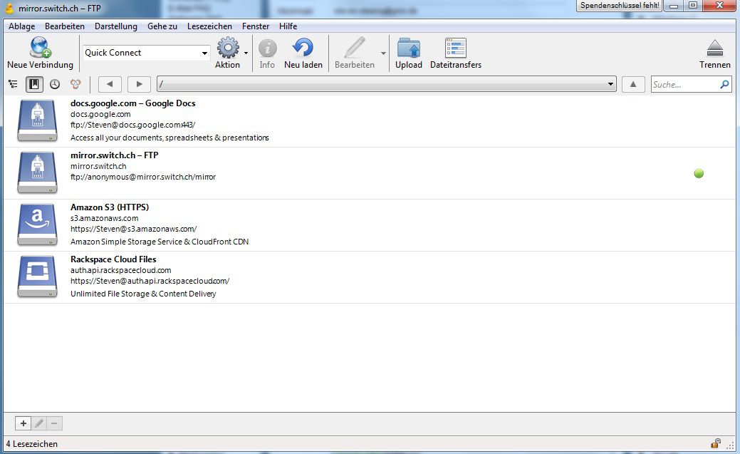 Cyberduck macht diesem Nutzer das Leben aber einfacher. Mit Cyberduck kann man über nur eine einzige Oberfläche per FTP, WebDav oder Cloud-Dienste auf die verschiedensten Speicher zugreifen. So kann man sich einfach mit dem Server verbinden und im nächsten Augenblick mit Google Drive.