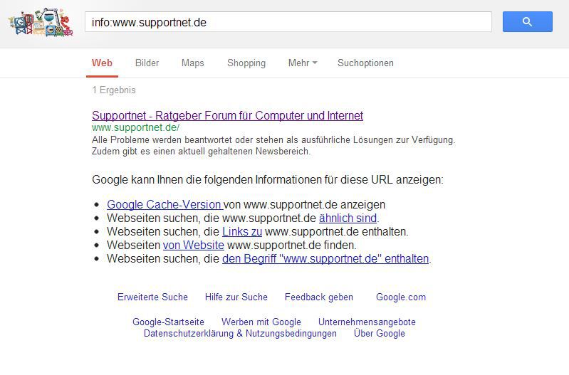 Wer Informationen über eine Seite finden will, bevor er diese besucht kann diese Informationen direkt über die Google Suche erfragen. Man erhält Informationen zu Seiten Google.Cache Version, Seiten die auf Supportnet verlinken und einiges mehr. Dazu gibt man den Operator "info:" vor die Seite. Beispiel "info:www.supportnet.de".