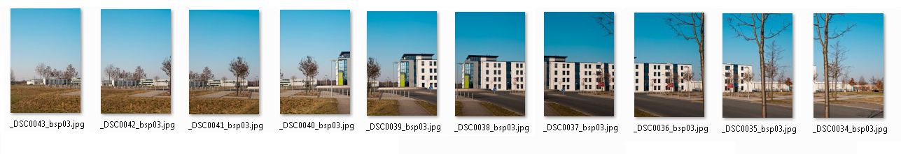 Je weiter Ihr Motiv auf dem Panorama von Ihnen entfernt ist, desto unwichtiger ist der richtige Standpunkt. Wenn Sie aber recht nah am Motiv stehen, und dazu noch eine eher kleine Brennweite nutzen, ergibt sich aus der Brennweite, das relativ nahes vergrößert und weiter entferntes stark verkleinert wird. Wenn Sie also nicht mittig vor einem breiteren Gebäude stehen, bedeutet dies, dass bspw. Gebäude schief wirken. Dies zeigt auch das Beispielbild. Die Einzelaufnahmen entstanden vom linken Straßenrand und damit nicht frontal vor dem Gebäude. Dadurch wirkt es jetzt, als wenn es auf der linken Seite höher ist als auf der rechten. Das Bild entstand mit einer Brennweite von 40mm an einer Kamera mit Verlängerungsfaktor 1,5. Wenn Sie noch kleinere Brennweiten nehmen ist der Effekt noch deutlicher.