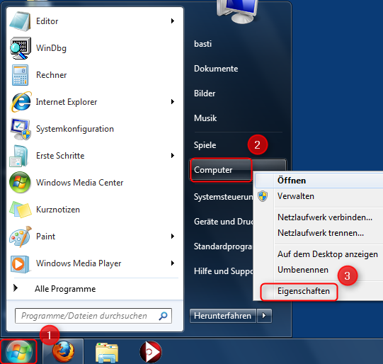 Klicken Sie auf den Windows Start Knopf (1), dann mit einem Rechtsklick auf Computer (2) öffnen Sie die Eigenschaften des Computers. Alternativ können Sie auch den Short-Cut "Windows-Taste + Pause" verwenden um die Eigenschaften zu öffnen.