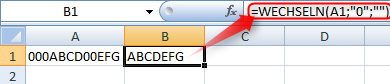 Denken Sie jetzt, dass das auch einfach mit der WECHSELN Funktion erledigt werden kann, so muss ich Sie leider enttäuschen. WECHSELN bewirkt nämlich, dass alle gewünschten Zeichen eines Strings umgewandelt werden. Möchte man die führenden Nullen entfernen, so würde man die „0“ also durch „“ ersetzen (Leere Anführungszeichen). Bei einem bestimmten Fall würde diese Möglichkeit sogar funktionieren. Haben Sie beispielsweise in Zelle A1 den String „00ABC“ stehen und Sie würden in Zelle B1 die Funktion
