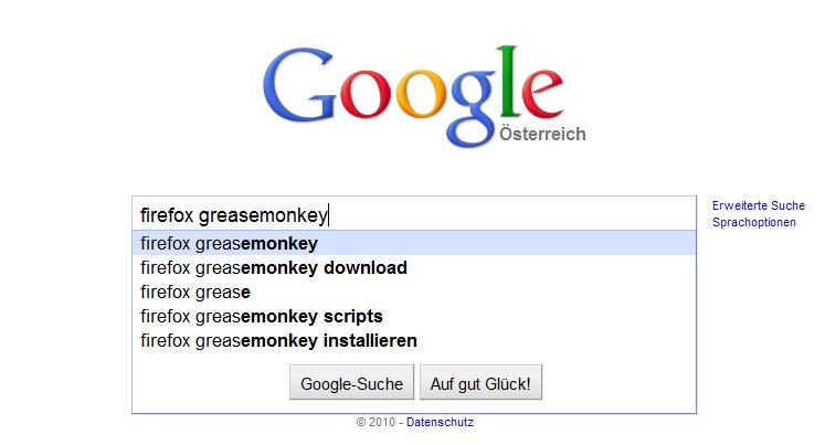 Zuerst starten Sie bitte einen der aufgeführten Browser und öffnen eine Suchmaschine. Dann geben Sie im Suchfeld bitte "firefox greasemonkey 0.8.20100408.6" ein.