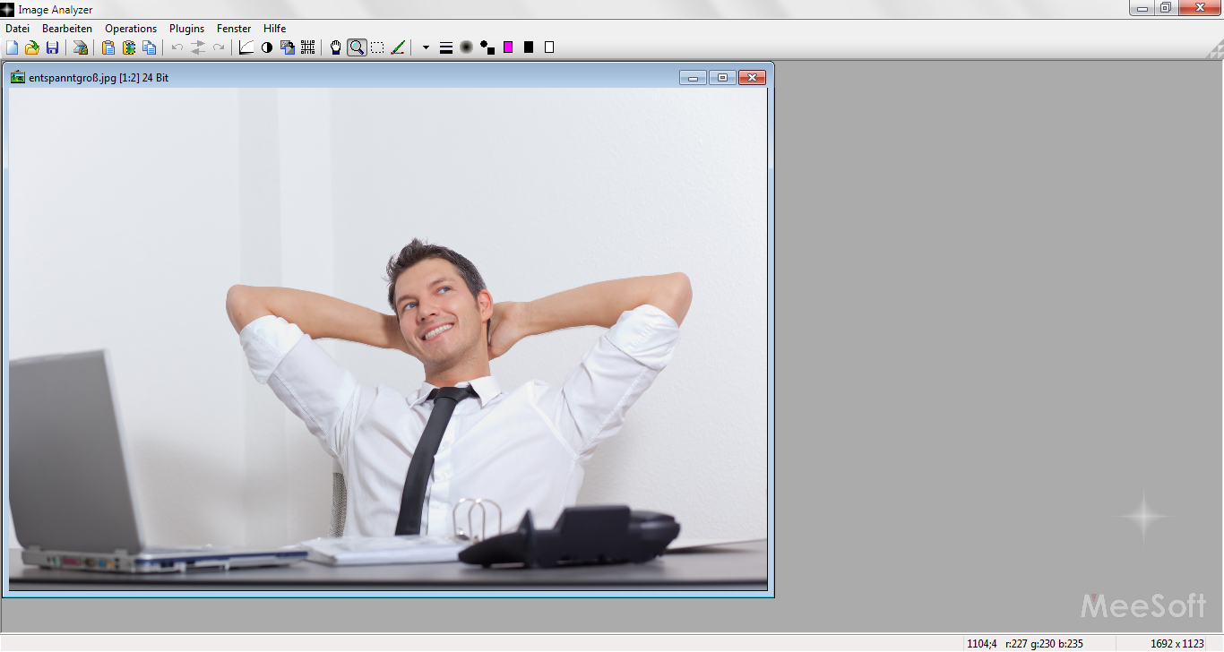 Image Analyzer kann problemlos ohne irgendwelche Einstellungen installiert werden. Wird das Programm geöffnet, so sehen Sie keine Arbeitsfläche. Öffnen Sie ein beliebiges Bild über „Datei“,  so erscheint dieses Bild in einem extra Fenster.