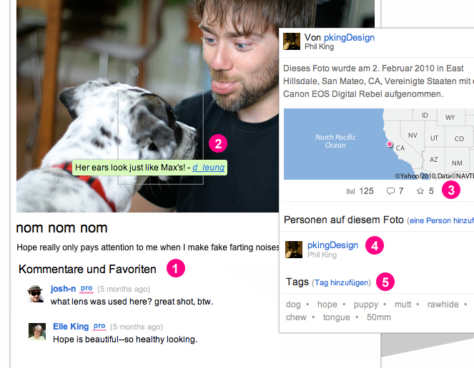 Der Beschreibungstext erscheint unter dem Bild, abenso wie die Kommentare anderer (im Screenshot bei der 1). Besonders ist die Möglichkeit kleine Kommentare auch direkt im Bild einzufügen (2). Außerdem kann man das Foto geografisch einordnen (3), Personen darauf markieren (4) und es mit Hilfe von Tags in Kategorien einordnen (z.B. Hund 5).