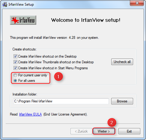 Wählen Sie unter (1) ob die Installation für alle Benutzer des Computers gelten soll (empfohlen) oder nur für den aktuell angemeldeten Benutzer. Klicken Sie danach auf "Weiter" (2).