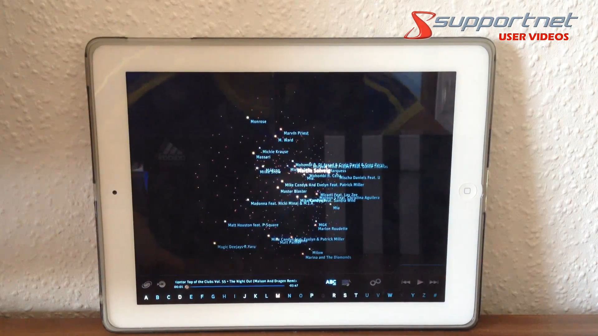 Im unteren Bereich befinden sich einige Funktionen. Hier wäre beispielsweise das „ABC“ Feature, man gibt einfach den Anfangsbuchstaben eines Liedes oder Interpreten an und bekommt dann alle Suchergebnisse präsentiert. Daneben befindet sich ein Icon, welches die Musik nach Playlists sortiert. Weiter geht es auch schon mit den Einstellungen, hier lässt sich die Optik skalieren, man kann aber auch die Geschwindigkeit einstellen, mit welcher die Galaxie sich bewegen soll. Auf diese Weise lässt sich die Optik den eigenen Bedürfnissen entsprechend hervorragend anpassen.