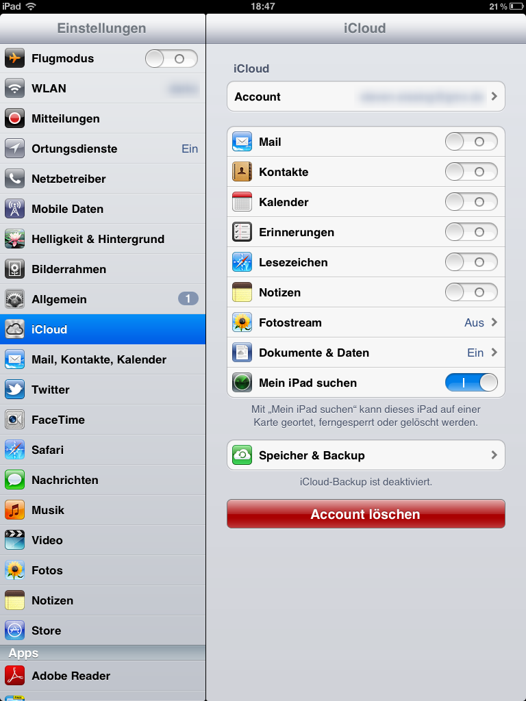 Da die iCloud fester Bestandteil des iOS 5 ist, finden Sie die Einstellungen für die Cloud in den iOS-Einstellungen Ihres iPads. Um zu diesen zu gelangen, müssen Sie die iOS-Einstellungen öffnen und auf den Menüpunkt „iCloud“ gehen. Ganz oben können Sie sehen, mit welchem Account Sie für die Cloud eingeloggt sind, bzw. welche Apple-ID verwendet wird. Darunter können Sie einschalten, was in die Cloud gesichert werden soll. Unter anderem können Sie auch über die Cloud Ihr iPad suchen lassen, falls Sie es einmal verlegt haben. Über „Speicher + Backup“ können Sie das iPad über die Cloud sichern. Denken Sie daran, wenn Sie ein Backup über die Cloud ausführen, wird das iPad nicht mehr über iTunes gesichert. Natürlich können Sie Ihren iCloud-Account hier auch löschen.