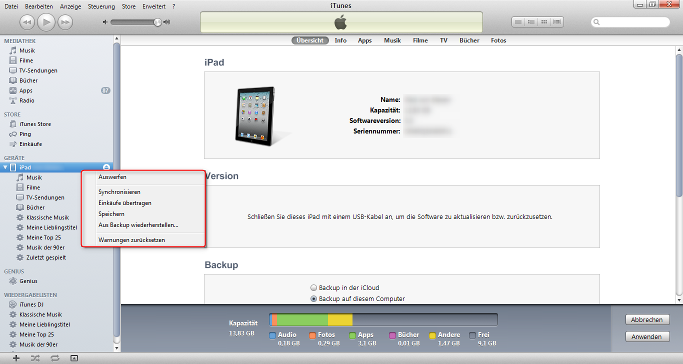 Haben Sie Ihr Gerät mit iTunes verbunden, so erscheint es unter „Geräte“. Sie können das Tablet ganz normal per Kabel (USB) anschließen oder seit iOS 5 per WLAN verbinden (siehe hier). Machen Sie nun auf Ihr Tablet einen „Rechtsklick“, so erscheint ein Kontextmenü. Über „Auswerfen“ können Sie Ihr Gerät wieder von iTunes trennen. Mit dem Punkt „Synchronisieren“ können Sie die Datenbestände von Ihrem Gerät mit denen von iTunes abgleichen (je nachdem, welche Datenbestände Sie vorher angeben haben, die synchronisiert werden sollen). Haben Sie sich ein paar Apps, iBooks oder sonstige Downloads über den App-Store gegönnt, so können Sie diese in die Datenbank der Apple Software mit „Einkäufe übertragen“ speichern. So könnten Sie sämtlich Apps auch auf ein anderes Gerät mit Ihrer Apple-ID synchronisieren. Mit dem Menüpunkt „Speichern“ können Sie ein Backup erstellen, welches Sie über „Aus Backup wiederherstellen“ wieder auf Ihr Tablet einspielen lassen können. Im Normalfall wird aber sowieso bei jeder Synchronisation vorher ein Backup erstellt.