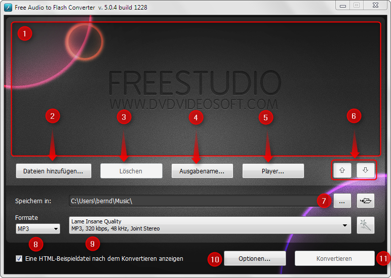 Nun kommt Punk 5, hier kann man schon den Unterschied zu normalen Konvertern sehen. Sie können hier einen Player für die Dateien festlegen. Der Player wird dann beim Aufruf der Flash Datei angezeigt. Wählen Sie also das Player Menü an, können Sie zwischen verschiedenen wählen, egal ob klassisch, modern oder bunt. Wie so viele andere Programme auch, kann dieses Programm die Dateien nicht gleichzeitig konvertieren. Es konvertiert die Dateien immer nacheinander und fängt bei der obersten im Vorschaufenster an. Möchten Sie die Konvertierung mit einer anderen Datei starten ist das kein Problem. Sie können die Reihenfolge beliebig über die Pfeile (Punkt 6) anpassen. Haben Sie nun die Grundschritte abgearbeitet können Sie nun noch einen Ausgabeordner angeben (Punkt 7). In diesem Ordner werden dann alle umgewandelten Flash Inhalte angezeigt. Sie können aber natürlich auch den Standardordner belassen, der vom Programm vorgegeben wird. Nun sollten Sie sich noch ein Format (Punkt 8) und eine passende Qualität (Punkt 9) aussuchen, bevor Sie mit dem Konvertieren starten. Die Optionen (Punkt 10) können Sie ignorieren, da hier keine Einstellungen gemacht werden können die Einfluss auf das Konvertieren der Audio Dateien hätte. Haben Sie nun alle Einstellungen getätigt und haben alle gewünschten Audio Dateien ausgewählt, können Sie die Konvertierung starten (Punkt 11).