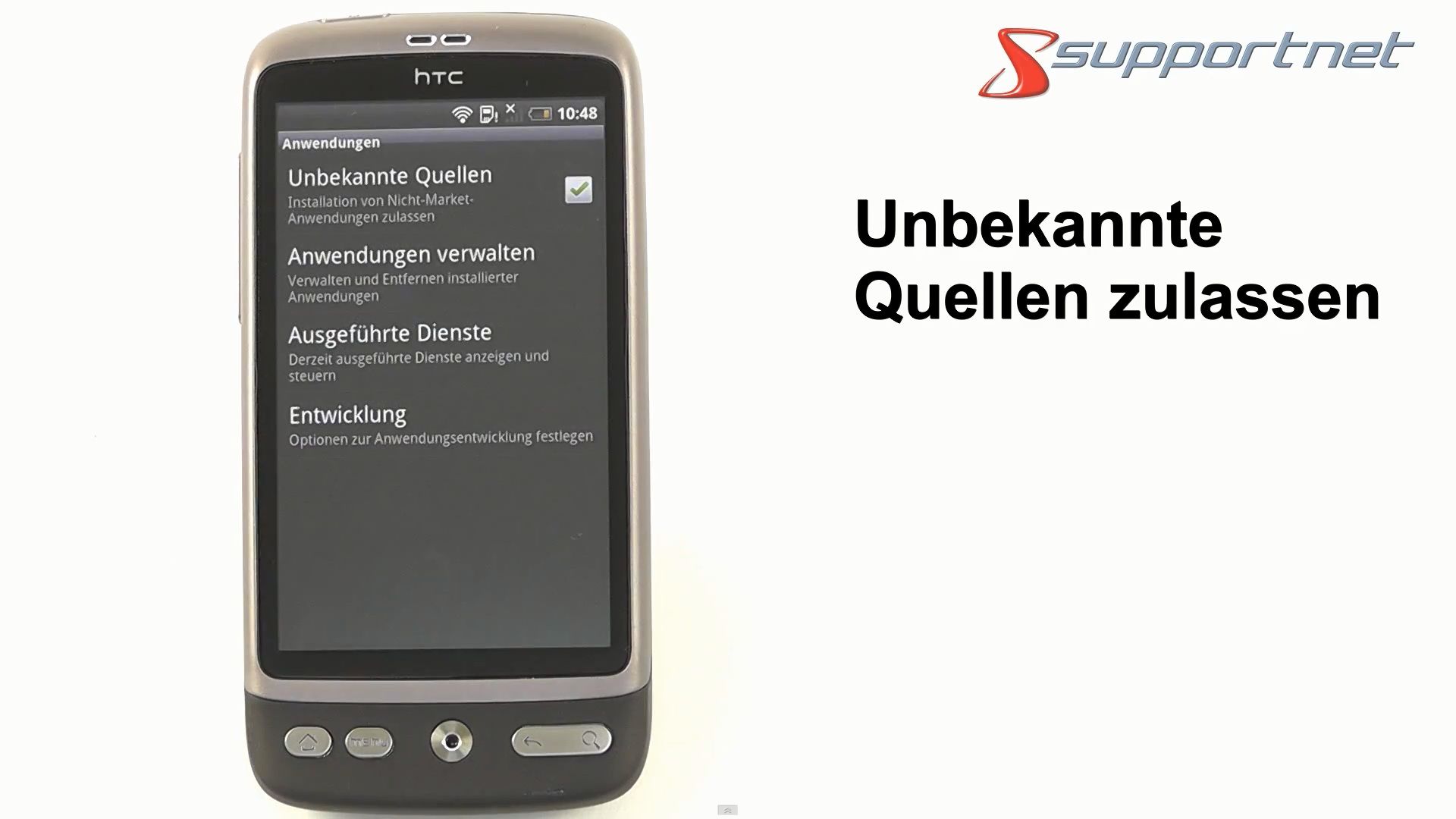 Als erstes müssen wir dem System sagen, dass es Installationspakete akzeptieren soll, die nicht vom Android Market kommen. Hierzu rufen wir das Menü auf, gehen in die Einstellungen, wählen den Menüpunkt „Anwendungen“ aus und setzen den Haken bei „Unbekannte Quellen“.