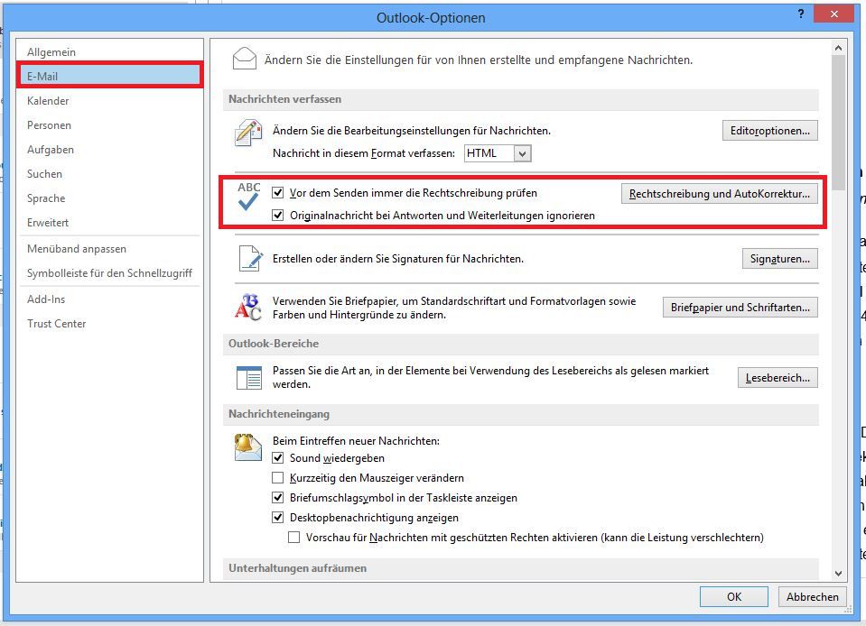 Die automatische Rechtschreibhilfe bei Outlook einschalten: