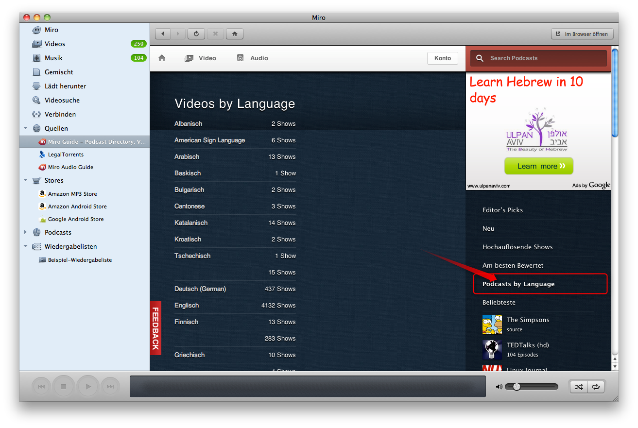 Eine sehr sinnvolle Option ist die "Podcasts by Language" Möglichkeit. Damit haben Sie die Möglichkeit nur die Podcasts zu durchforsten, die auch in Ihrer Sprache angeboten werden.