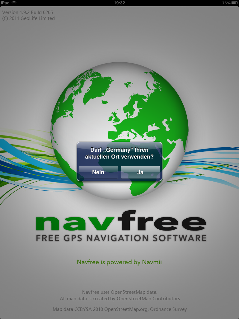 Starten Sie navfree das erste Mal, so werden Sie nach der Berechtigung für den eigenen Standort gefragt. Besonders bei einer Navigationssoftware ist es wichtig dass Sie diesen Punkt mit „ja“ bestätigen. Sie können diese Option natürlich auch über die iOS Einstellungen wieder nachträglich ändern. Sollten Sie hier „nein“ wählen, so kann es sein, dass die Software Ihren aktuellen Standort nicht finden kann und Ihnen somit keine geeigneten POIs (Lokalitäten in Ihrer Nähe die von Interesse sein könnten) anzeigen kann.