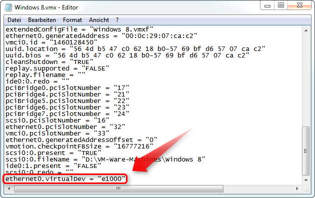 In diesem Ordner liegt eine *.vmx datei, welche Ihr mit dem Texteditor öffnen müsst. In dieser Datei findet ihr die Einstellungen für die VM mit den Netzwerkproblemen.