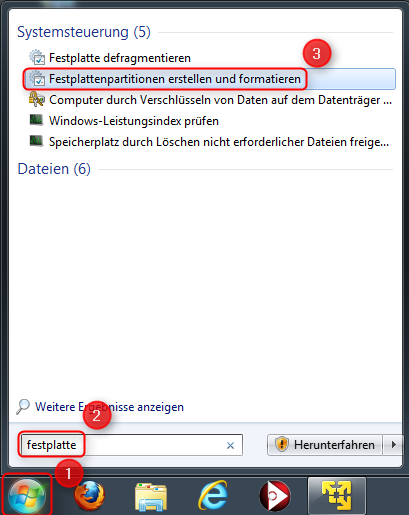 Klicken Sie auf den Windows 7 Startknopf (1), geben Sie in das Suchfeld "Festplatte" (2) ein und klicken Sie auf "Festplattenpartitionen erstellen und formatieren" (3).