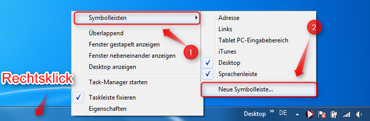 *Sollte dies nicht der Fall sein, klicken Sie mit der rechten Maustaste in die Taskleiste, navigieren auf Symbolleisten und setzen den Haken bei "Quick Launch"