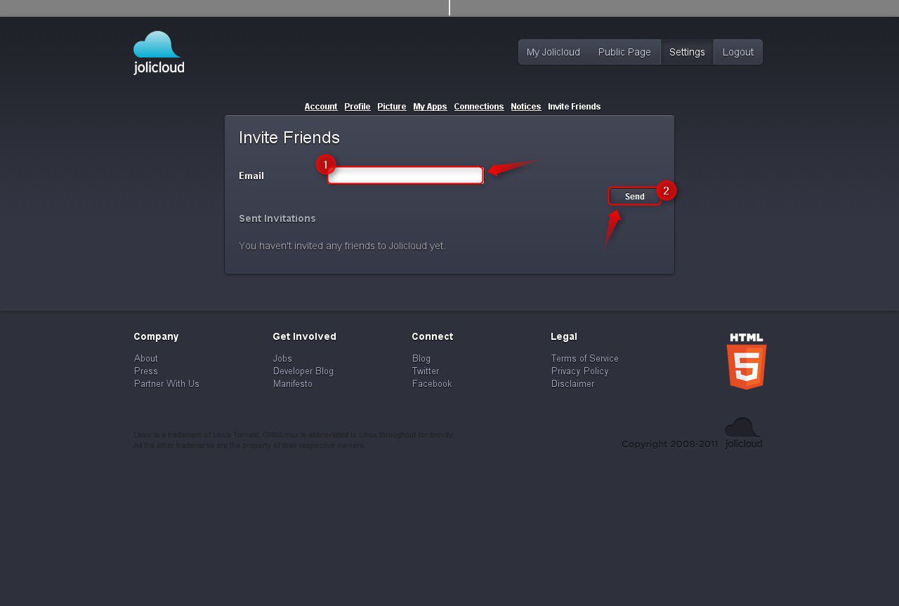 Schritt 1: Zu aller erst gehen Sie bitte auf http://my.jolicloud.com/settings/invitations. Sie geben nun bitte die Email Adresse Ihres Freundes in das dafür vorgesehene Feld ein und drücken dann auf „Send“ um Ihre Einladung zu versenden.