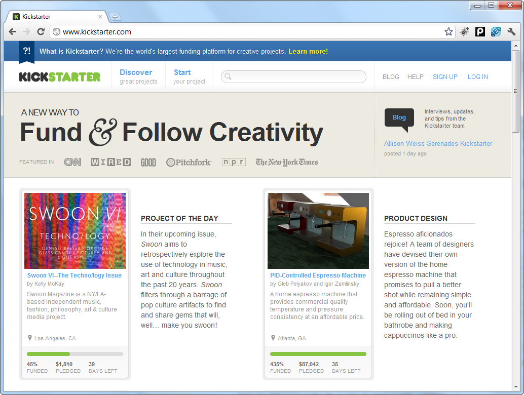 Wer nicht selber das Geld besitzt, muss jetzt auf die Suche nach Geldgebern gehen – und dabei will Kickstarter helfen.