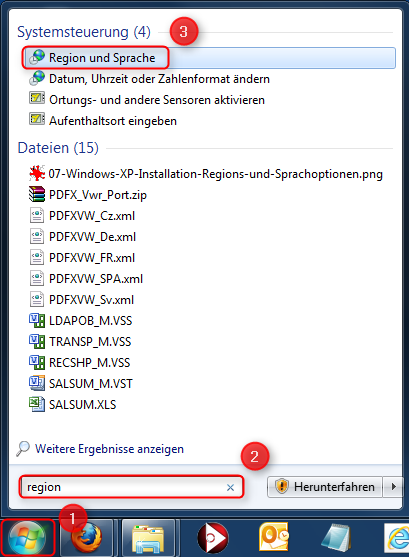 Klicken Sie auf den Windows Startknopf (1), geben Sie in das Suchfeld "region" ein (2). Drücken Sie dann die Entertaste oder klicken Sie auf "Region und Sprache" (3).