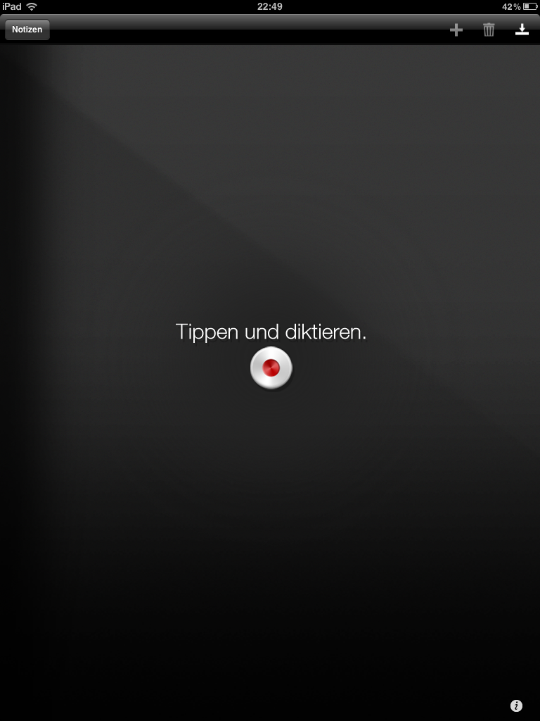Die Bedienung von Dictation ist sehr einfach und intuitiv gehalten. Öffnen Sie die App Dictation, so wird Ihnen ein fast leeres Display angezeigt. In der Mitte gibt es einen Aufnahmeknopf. Sie können nun irgendwo auf das Display tippen um in den Aufnahmemodus zu gelangen.