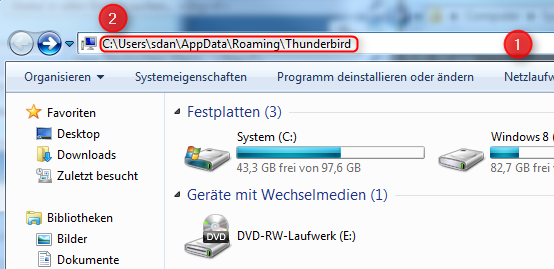 Markieren und kopieren Sie den Pfad bis „…Thunderbird“ (4) und schließen Sie Thunderbird.