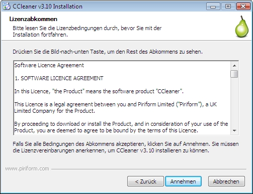 Bestandteil fast jedes Installers ist ein Dialog, in dem Ihnen das Lizenzabkommen vorgezeigt wird. Erst wenn Sie dieses akzeptieren, können Sie das Programm installieren. Ob Sie die häufig ellenlangen Texte tatsächlich durchlesen, bleibt natürlich Ihnen überlassen. Größtenteils handelt es sich um rechtliche Standardtexte. Nicht wundern: Bei manchen Installationsprogrammen können Sie die Weiter-Schaltfläche erst drücken, nachdem Sie den gesamten Lizenztext nach unten gescrollt haben.