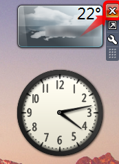 Fahren Sie über ein Gadget und Sie werden merken, dass am rechten Rand vier Funktionen erschienen sind. Fangen wir von unten an: Das Feld mit den 12 Punkten ist dazu da, das Gadget auf dem ganzen Bildschirm zu verschieben. Das Werkzeug darüber ist sind die Optionen. Hier können sie beispielsweise beim Wetter den Ort oder die Anzeige der Temperatur auswählen (Celsius oder Fahrenheit). Darüber im Feld mit dem Pfeil in dem Quadrat können Sie das Gadget vergrößern für mehr Details, zum Beispiel Wettervorhersage. Was Sie aber jetzt benötigen ist die oberste Funktion und zwar das Kreuz. Klicken Sie darauf und die Anwendung wird verschwinden und auch beim nächsten Start nicht mehr erscheinen.