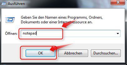 Tragen Sie hier "notepad" ein und klicken Sie bitte auf "OK" oder drücken "Enter"