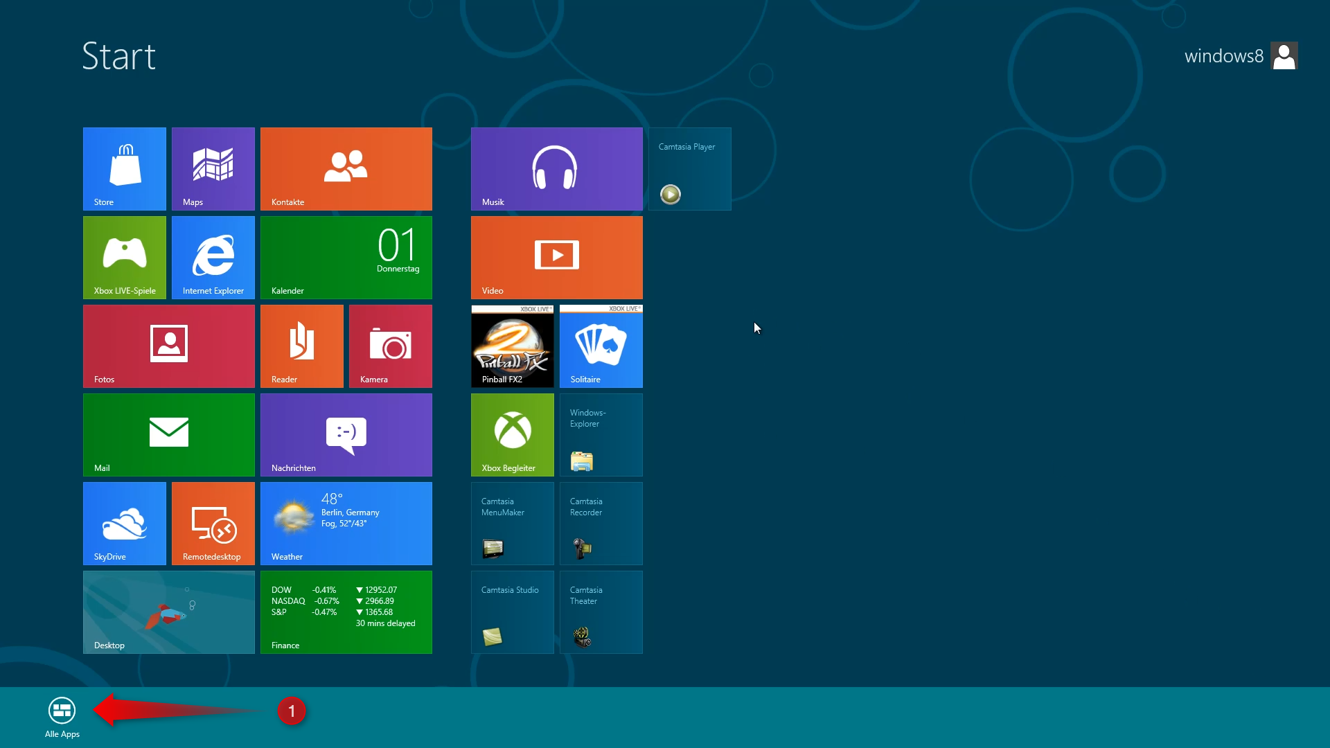 Wird ein Rechtsklick im Startmenü auf eine freie Fläche ausgeführt, so erscheint unten eine Leiste, bei der wir uns alle Apps anzeigen lassen können (1).