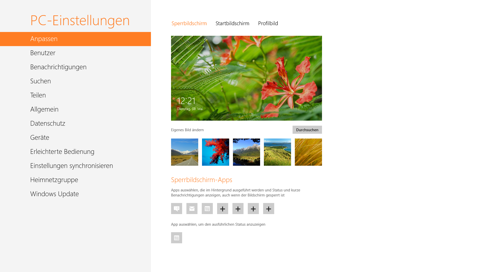 Hier kann das Bild für den Sperrbildschirm und dessen Apps geändert werden. Außerdem kann man hier das Design des Startmenüs, sowie das eigene Profilbild ändern.
