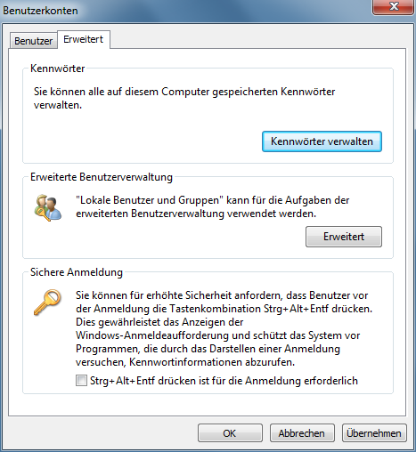 Es öffnet sich jetzt wiederrum ein Fenster mit dem namen "Benutzerkonten". Hier wählt man oben den zweiten Reiter "Erweiter" an.